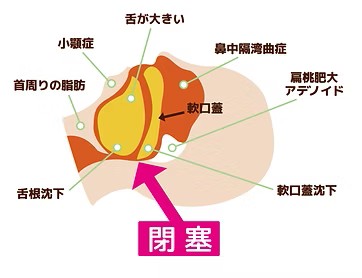 肥満、小さい顎、扁桃肥大などが原因となり、舌や軟口蓋などが喉の奥に落ち込み気道を塞いでしまうことにあります。