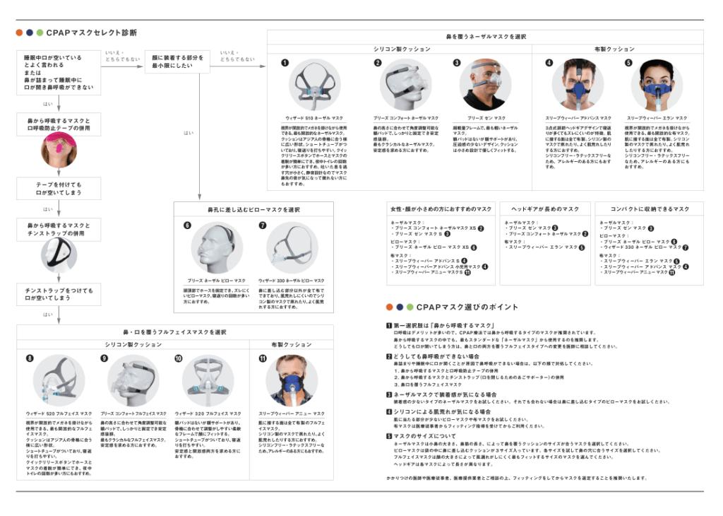かかりつけの医師や医療従事者、ねむりの樹専門スタッフにご相談の上、フィッティングをしてからマスクを選定することを推奨いたします。